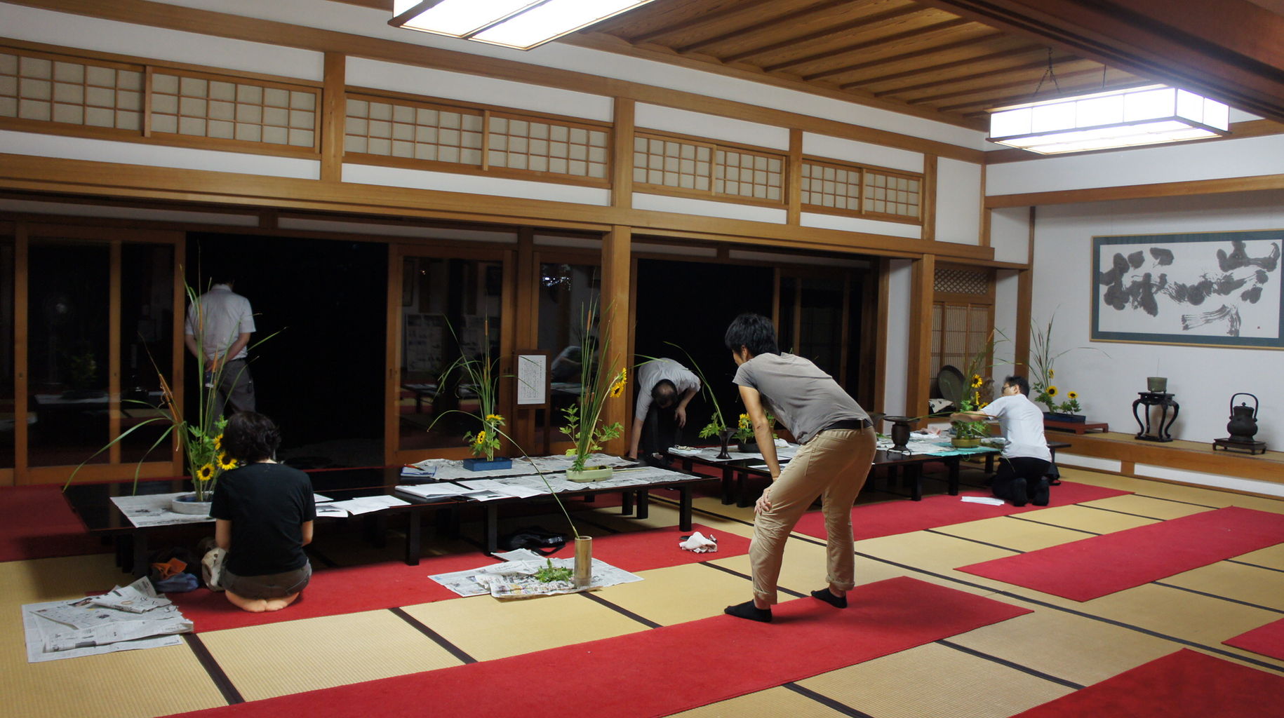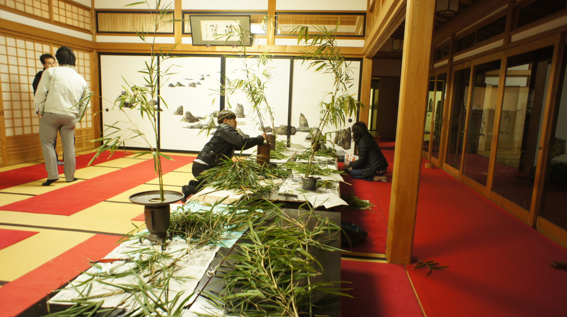 いけばな展の終わった後、片付けの手伝いに来た日本建築専門学校の学生を家元に紹介してねぎらいの言葉を掛けていただいた。